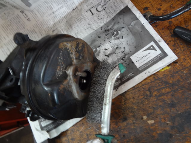 フルードで錆びた面の腐食の進行を防ぐため、錆びをブラシで斫ります。