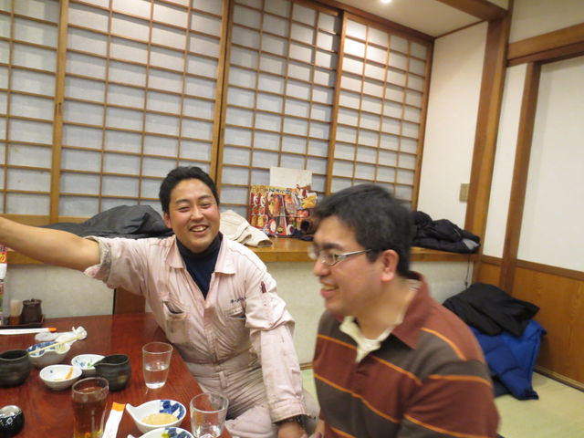 市川クンとメカニックどうしの熱い話。 こちらはお酒飲まない組。