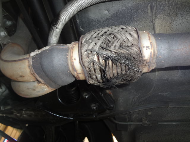 フロントパイプのフレキシブル部に排気漏れがあります。