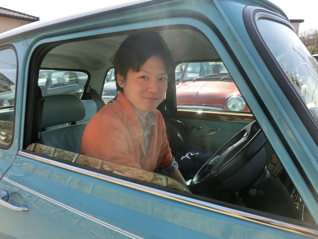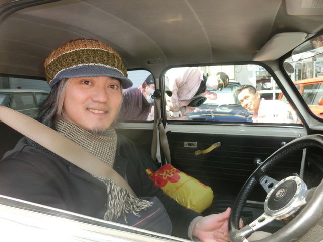 オールドイングリッシュホワイトのキャブクーパーに座ってなんだかMINI乗りの気分?