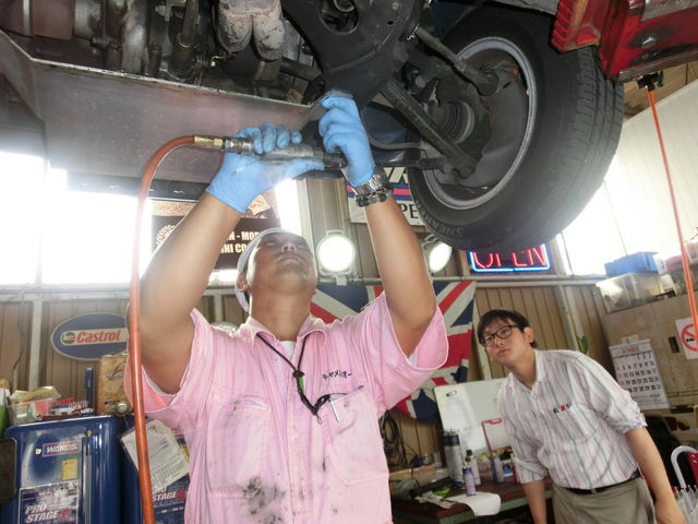 初めてリフトアップされる愛車を一緒にチェックのKT様。