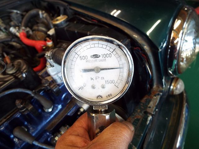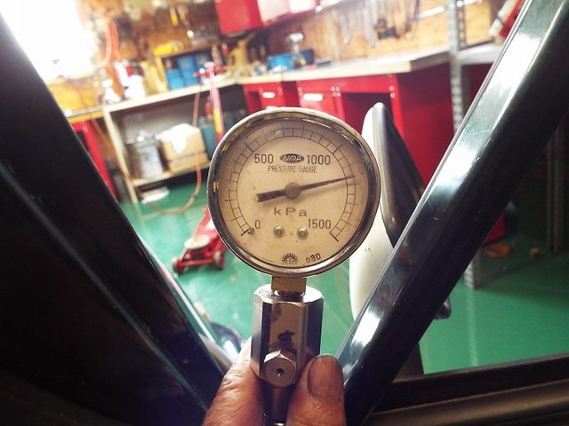 フィルターヘッドに油圧計を取付け、オートマにかかる油圧をチェックします。