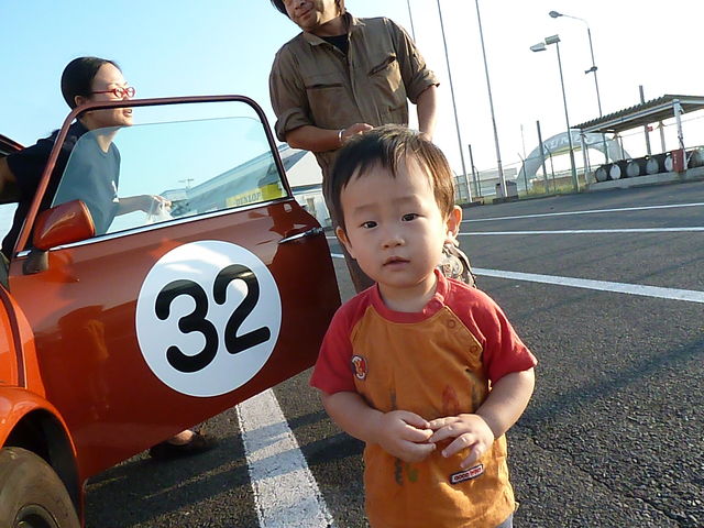 オレンジのレーシングスーツ つなぎの胸にはジョークで 田中オート って書いてあるし、