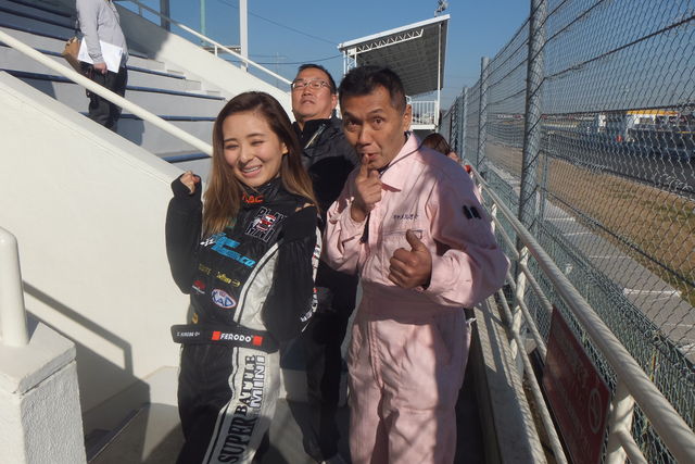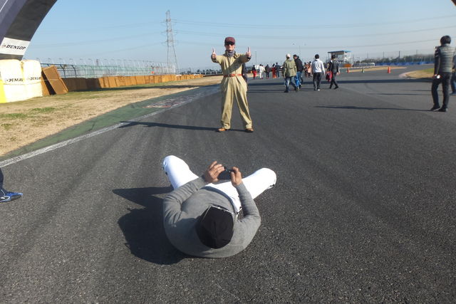 ダンロップゲートをバックにてつさんを撮るちょんあーさん。