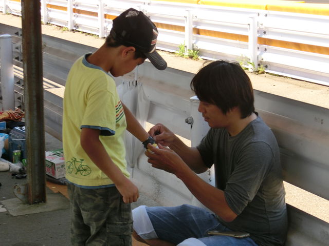 フロントタイヤの前でう○こ座りの天野選手。