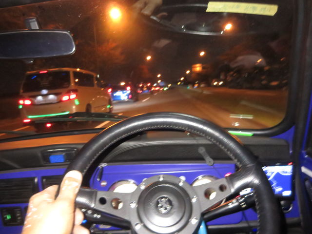 乗った感じでは、やや右に流れて、直進時のステアリングの角度は左に10度。