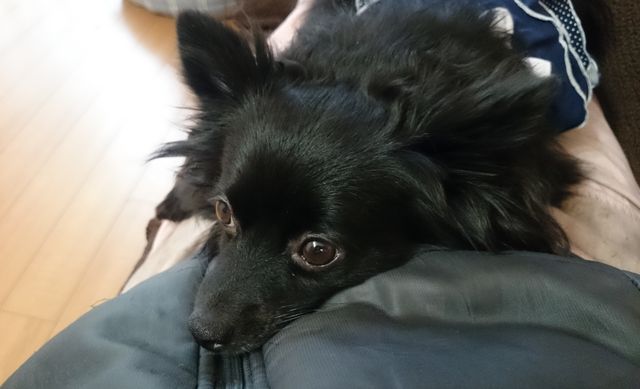 朝ご飯食べてご満悦で人の腹の上