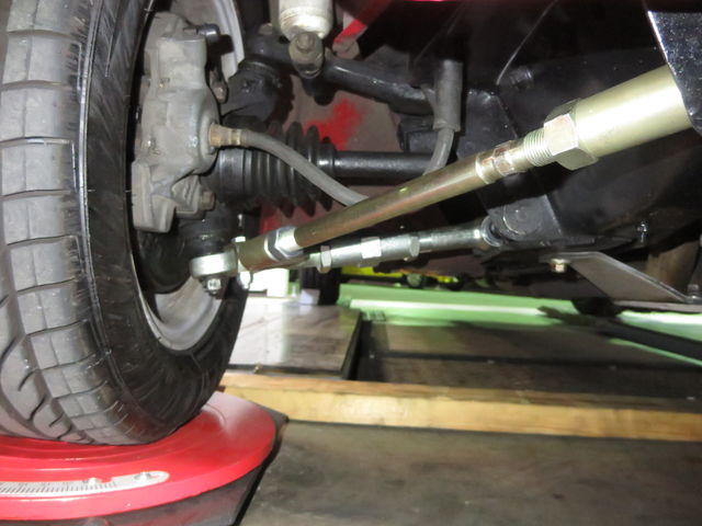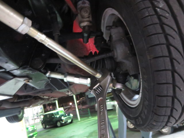 4輪アライメントテスターで数値重視で調整してから、実走行で直進性を確認しながらハンドツールで微調整します。