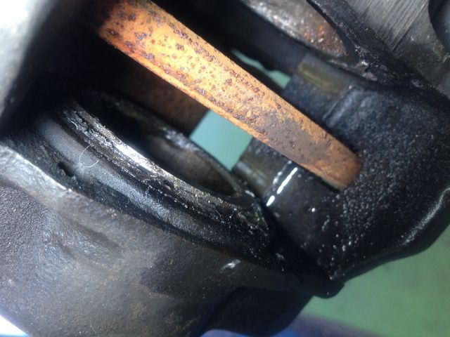 先日のブレーキ片効きで動きが悪い状態だったのが動き出して漏れた・・・。