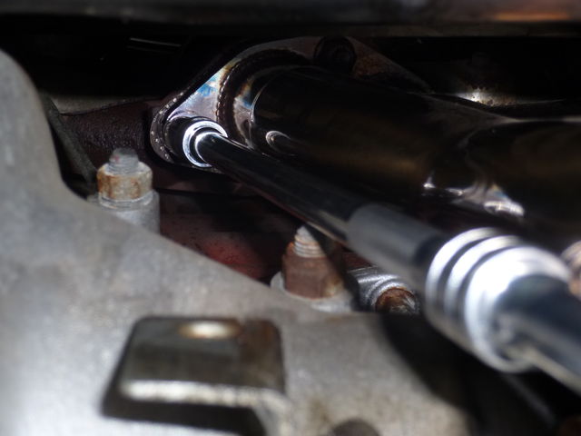 ダウンパイプのフランジ部に、排気漏れの痕が見えます。