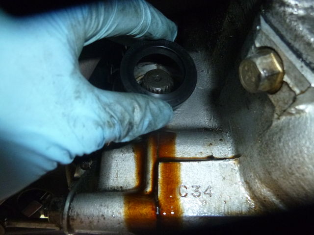 エンジンとミッションの合体部の半月オイルシールとクランク