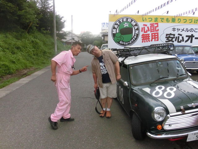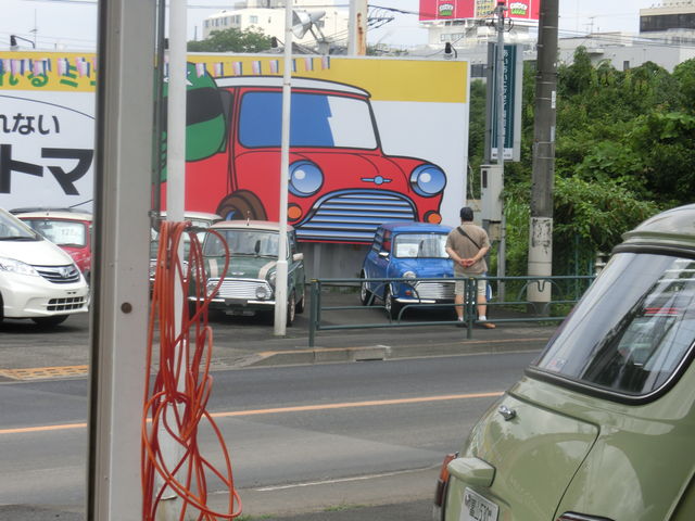 まったーマンが乗る赤いミニの看板の前に・・・・