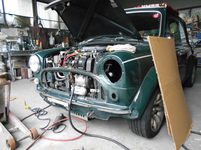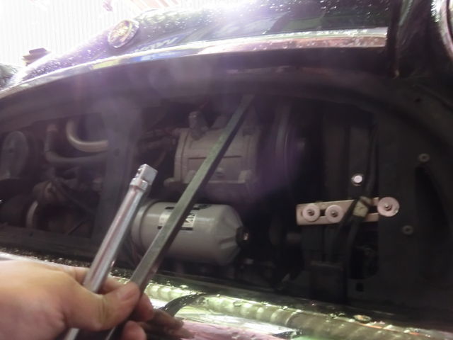 鈑金工場まで行けるようにグリル外してフロントパネルとオルタネーターの間も少し広げておきます。