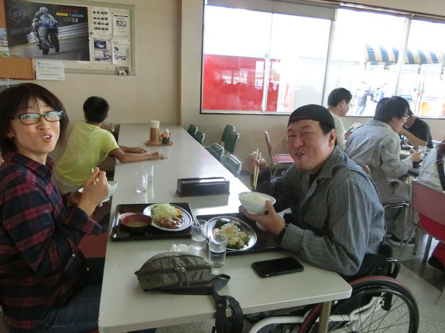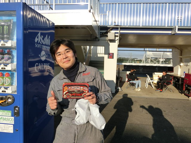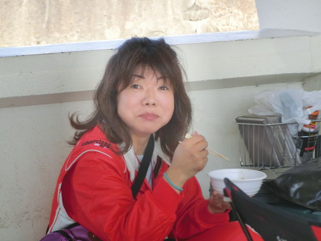 クーラント漏れで早々に戦線離脱が決まってしまった國田さんは朝食中。。