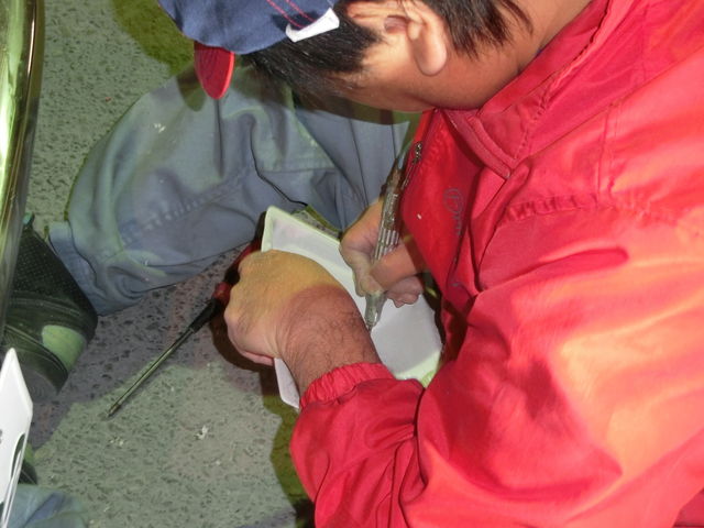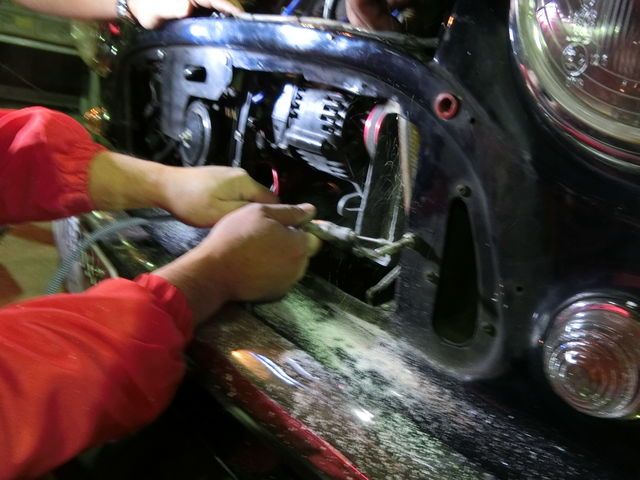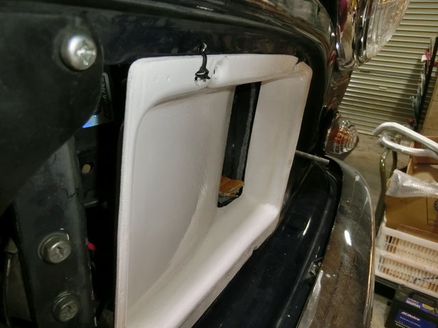 取付済みのラジエターボックスの方の穴も広げて新吸入ダクトに合わせていきます。
