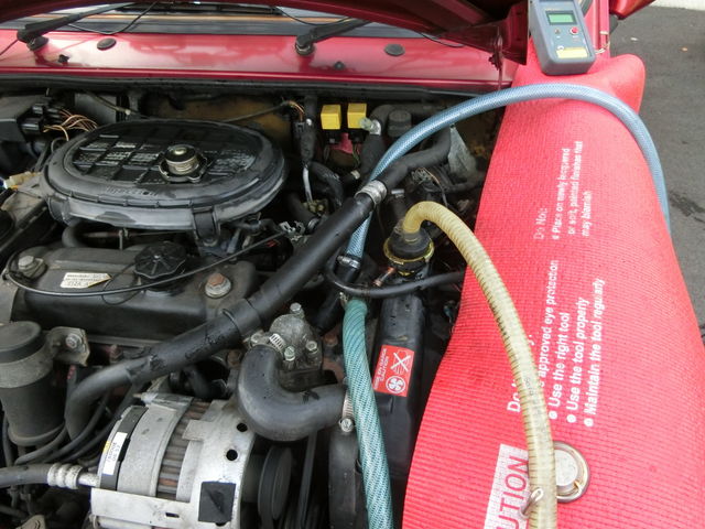 洗浄剤のラジエターフラッシュ注入して洗浄開始。