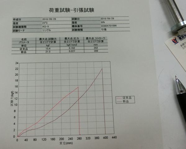まずは素材としての強度と柔軟性の基本データがとれました。