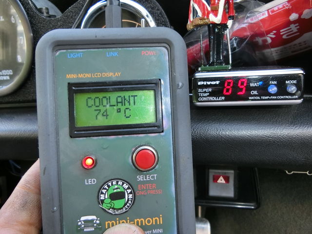 おや、エンジン掛けてすぐに、ミニモニで表示される水温センサーとラジエターに挿した温度計が同時に上昇してます。