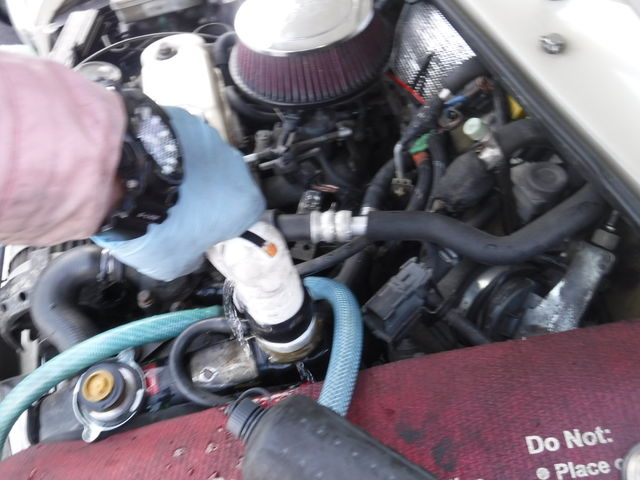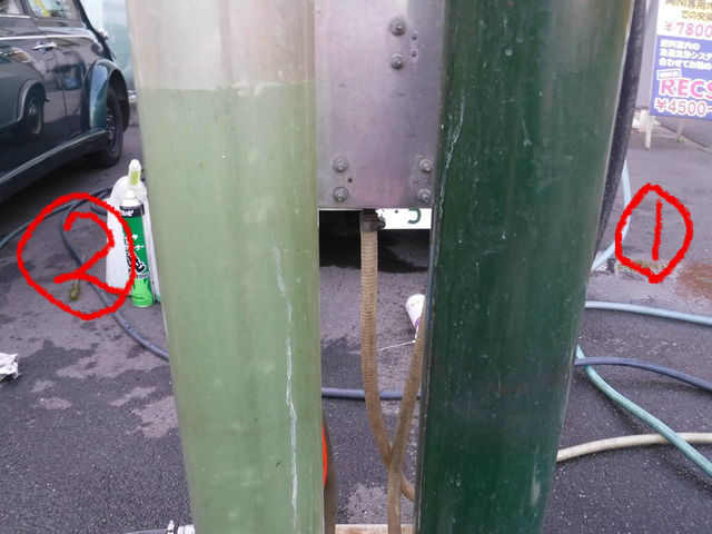 続いてバイパスホースを塞いで水を逆流させ、ヒーターコアの汚れを吸い出します。