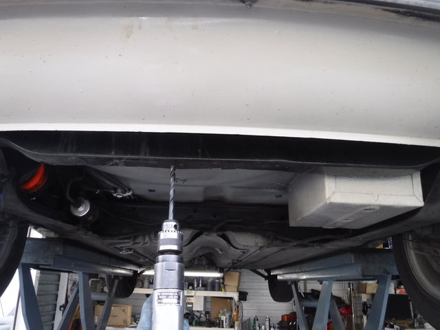 センターマフラーの新しいブラケットは、既に在る穴とはピッチが合わないので新規にあけます。