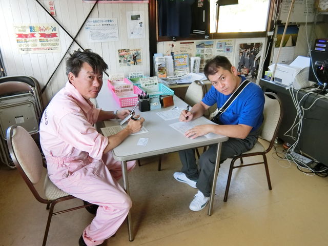 本庄初の二人は講習受けるために申し込み書記入中。