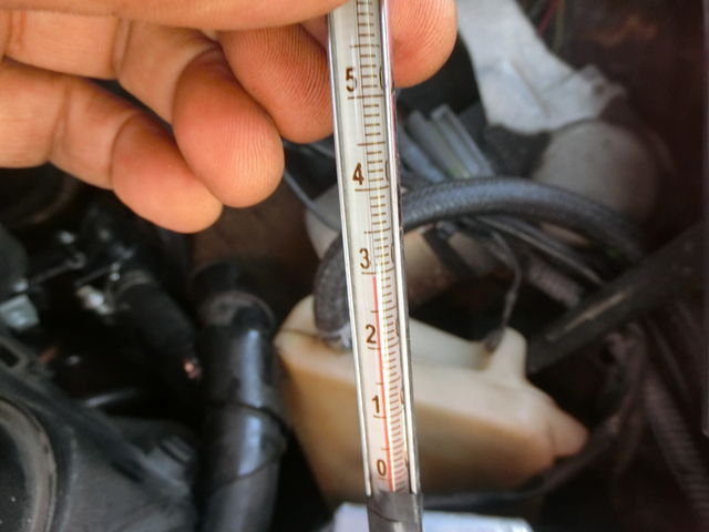 ラジエターに挿した水温計は30℃