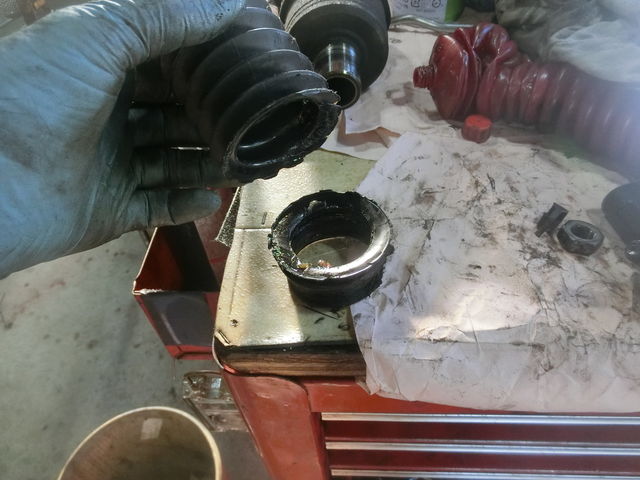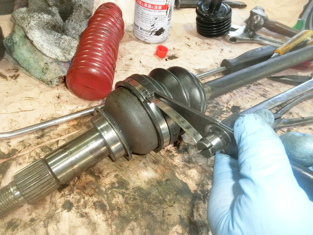 アウターブーツ交換です。特殊工具を使用するとバンドン締め付けが