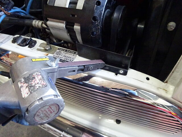 ベルトの安全カバーがリベット留めだったのでベルトサンダーで飛ばして作業します。