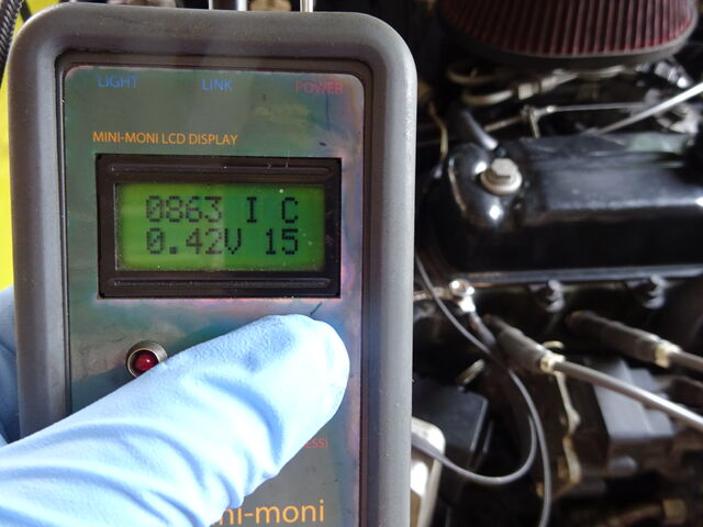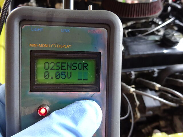 上 O2 SENSOR - O2センサーの電圧およびその状態を表示。アイドリング時は0.4V以下(リーン)~0.6V以上(リッチ)を常に上下しています。