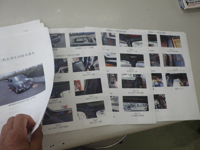 歪測定のために何か所にも電極を付けて、段差を乗り越えた時のボディの歪を測定して強度試験を行ってもらいます。