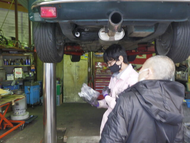 ご来店いただいたので、リフトアップして SBY 様と一緒に下回り点検いたします。