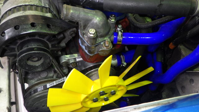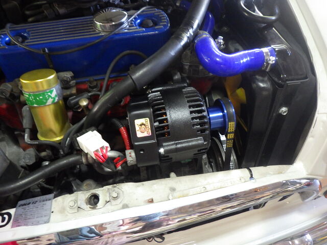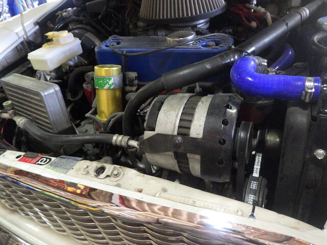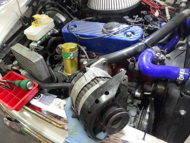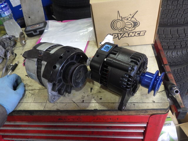 新旧交換の義 新しく取り付けるオルタネータは発電効率がよく抵抗の少ないブラックオルタネーターです。