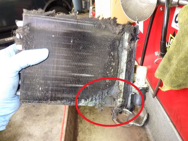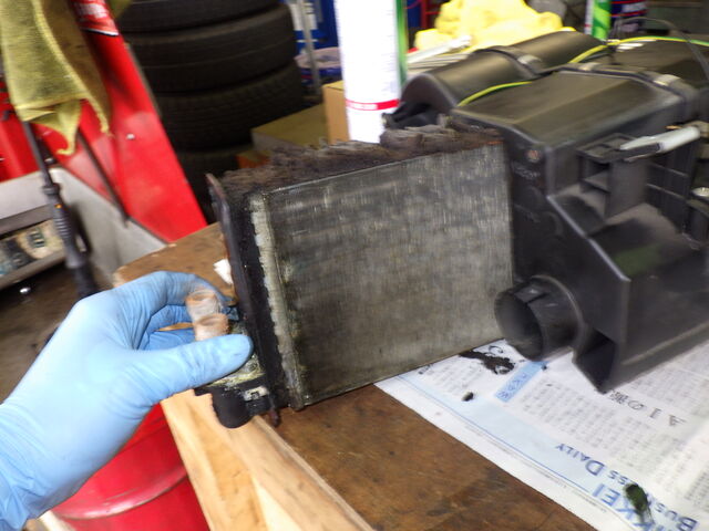 ヒーターユニットからヒーターコアを取り外しました。ヒーターコアにはやはり漏れたあとがありました。