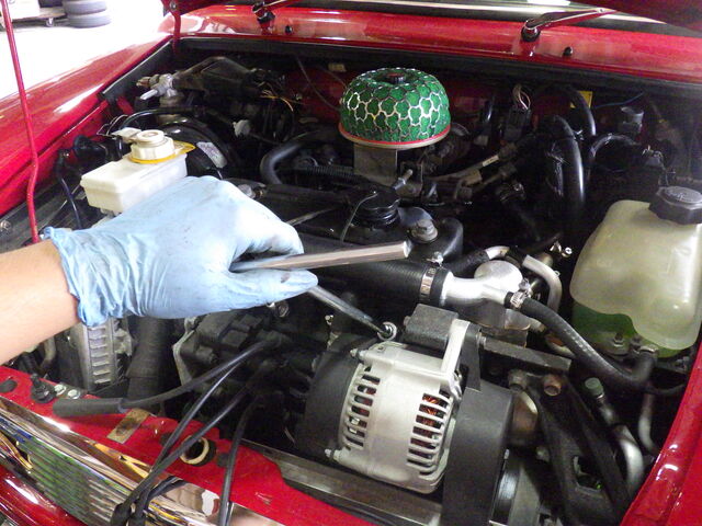 バイパスホースのサーモ側の口が傷んでいたので、少し切って長さを合わせておきました。