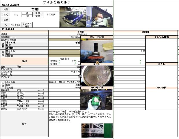 今回初オイル交換だったのでオイルカルテを作成しました。今後オイル交換ごとにこちらのオイルカルテを更新していきます。次回のオイル交換は3000km走行か6ヶ月のどちらか早いほうです。