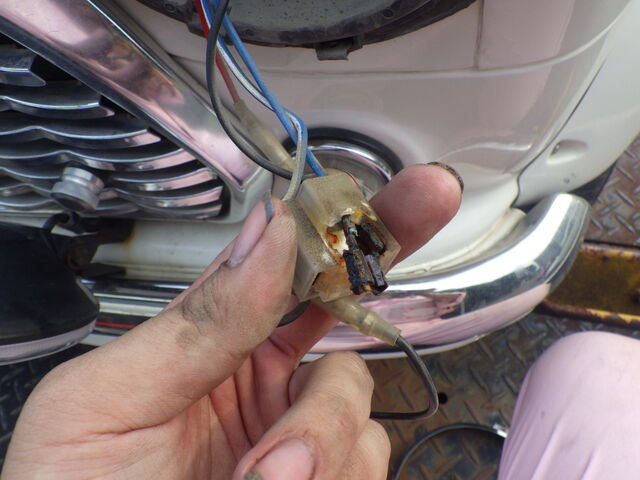 左のカプラーが焼けてしまっています。車検用のヘッドライトに交換して光量はOKでしたので戻すときに一緒にカプラーを交換しておきます。
