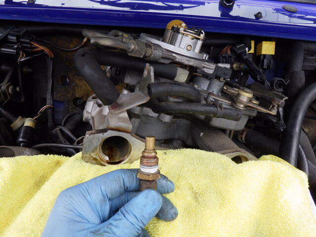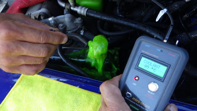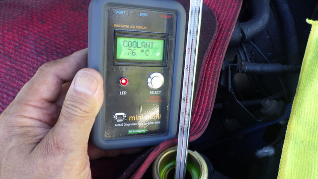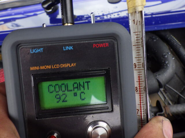 ミニモニ(ECUチェッカー)をセットしてラジエーターキャップを外して温度計をセット。