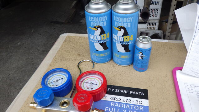 クーラーガスを充填します。右の小さい缶はコンプレッサーのオイルです。