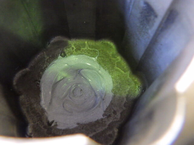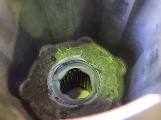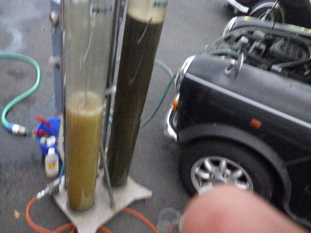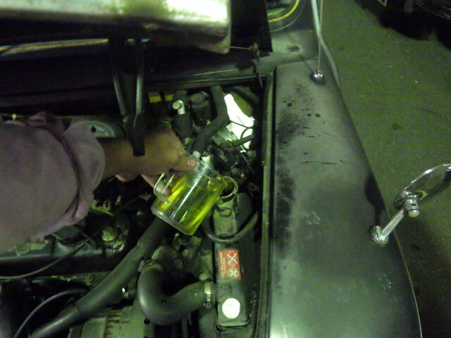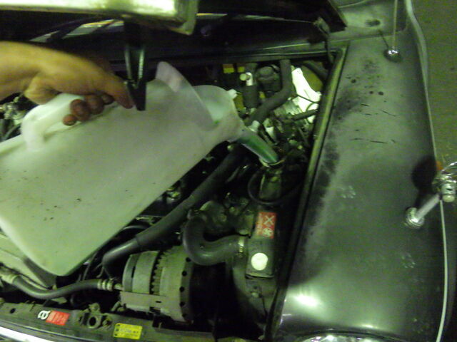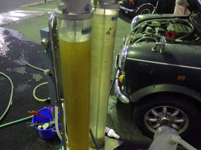エンジン内のクーラントをすすぎ出し。抜いたクーラントはだいぶ汚れていました。汚れが多いので何度かすすいでおきました。