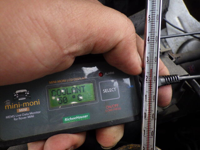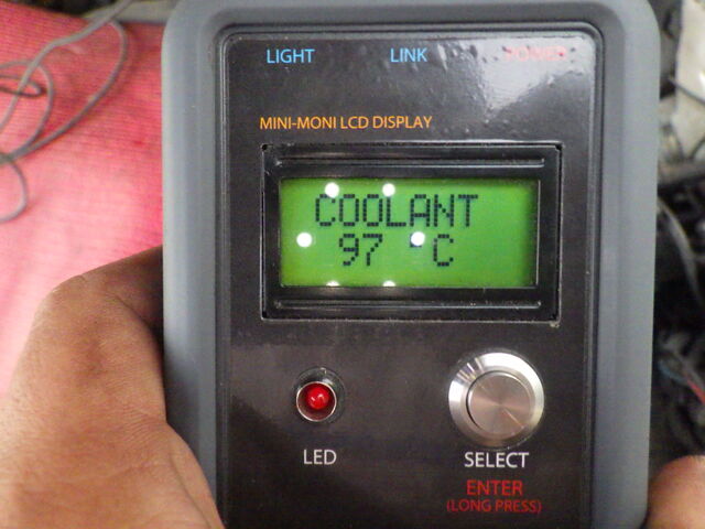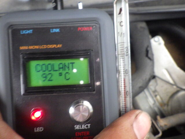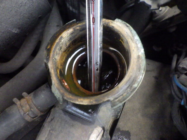 サーモスタッドの動作チェック。エンジン側の水温センサーとラジエーター側の水温計に差があります。サーモは閉じています。