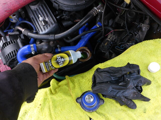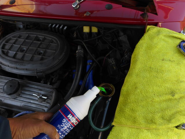 エンジンルーム内、水路配管周りの漏れ跡は見られませんでしたので早速ラジエターフラッシュ液を