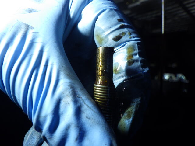 オイル交換のためオイルを抜いていきます。抜いたオイルの色は濃褐色でした
