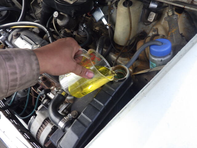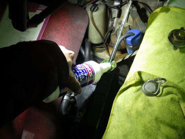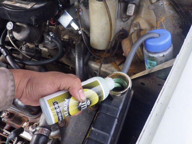 ラジエーターに洗浄剤を投入。暖気をしながら洗浄剤を循環させます。
