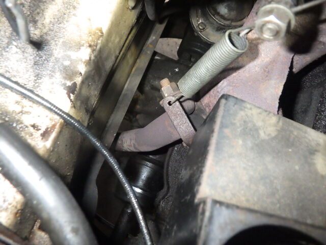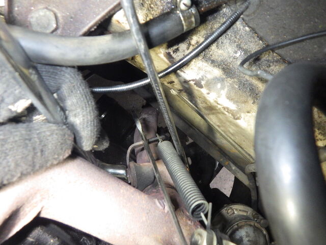 スロットルのリターンスプリングがエキマニとダウンパイプのクランプボルトに共締めされています。