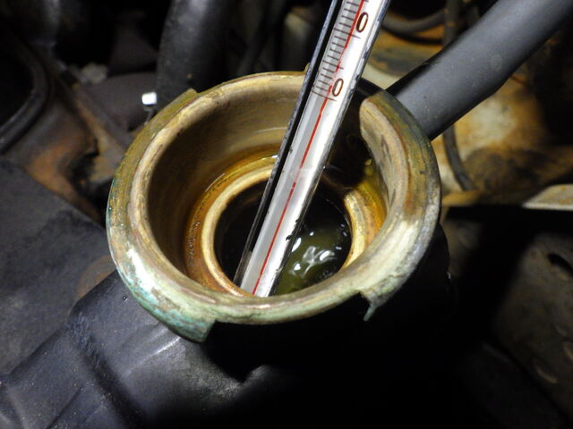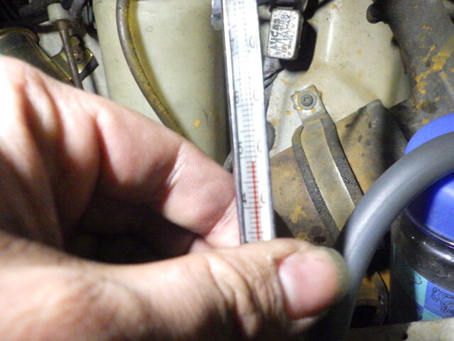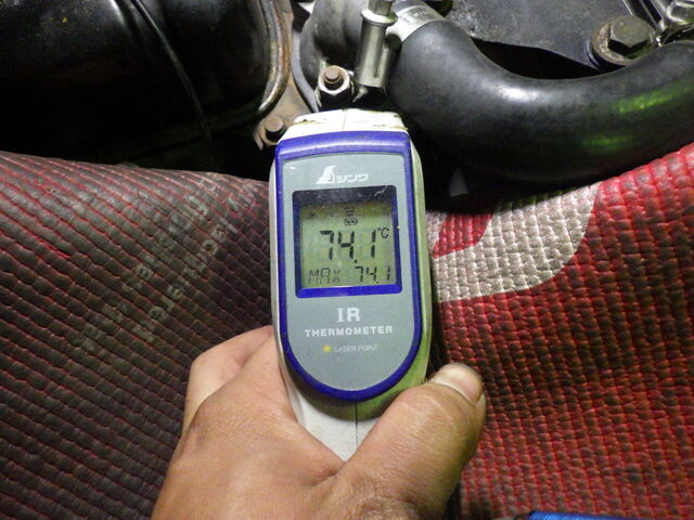 サーモスタッドの動作をチェック。エンジン側の温度は74℃