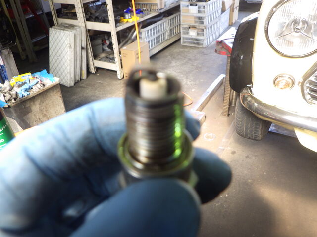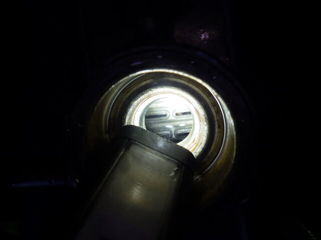 ヒーターコアの漏れチェック。緑色のしずくが見えます。ホースから漏れているような感じ、ホースバンドを増締めして漏れが止まるかチェックしておきます。