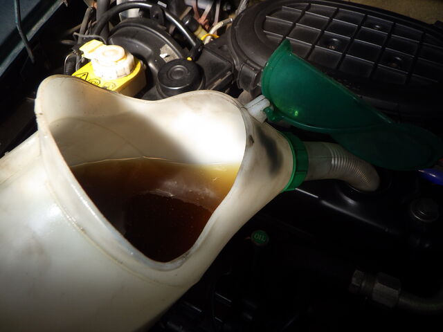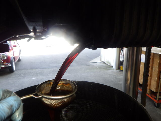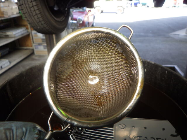 オイル交換のためオイルを抜いていきます。抜いたオイルの色は褐色でした。