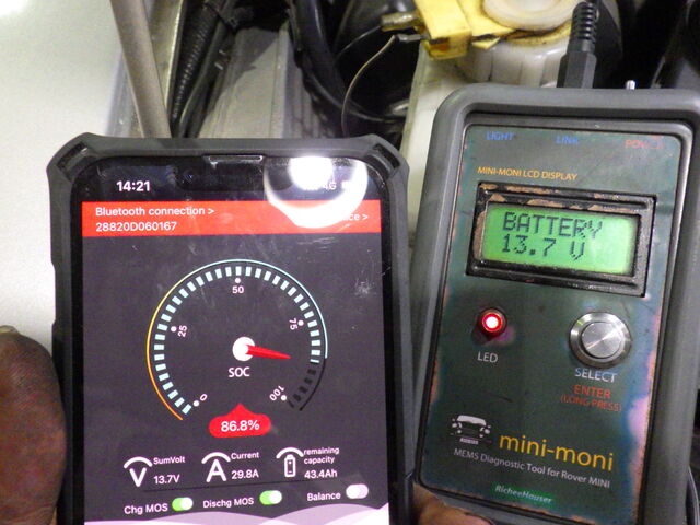 普通なら即オルタネーターの発電不良だろうってことになるところですが、MINI専用リチウムイオンバッテリーは入力電圧が高くなると充電を止める・・という保護回路があります。