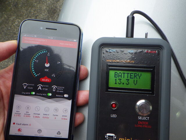 NBYさんは、リチウムイオンバッテリーの専用アプリで、バッテリーの残量、電圧、入出力電圧などをリアルタイムにモニターしていたので走行中にバッテリーが放電を続け、残量が減っていくのを見ながら走ってこれそうとの判断でキャメルまで来てもらいました