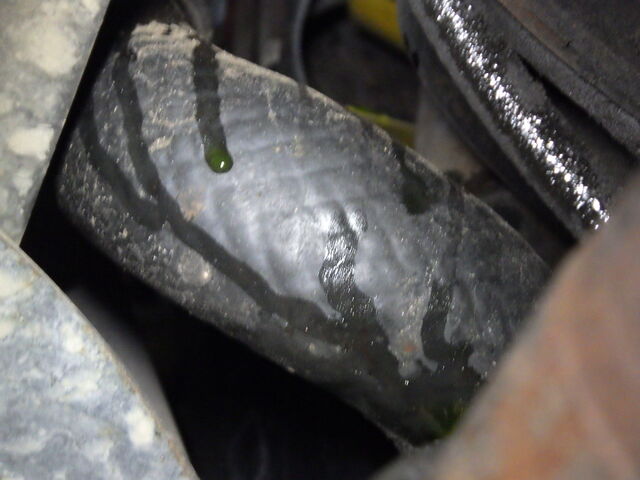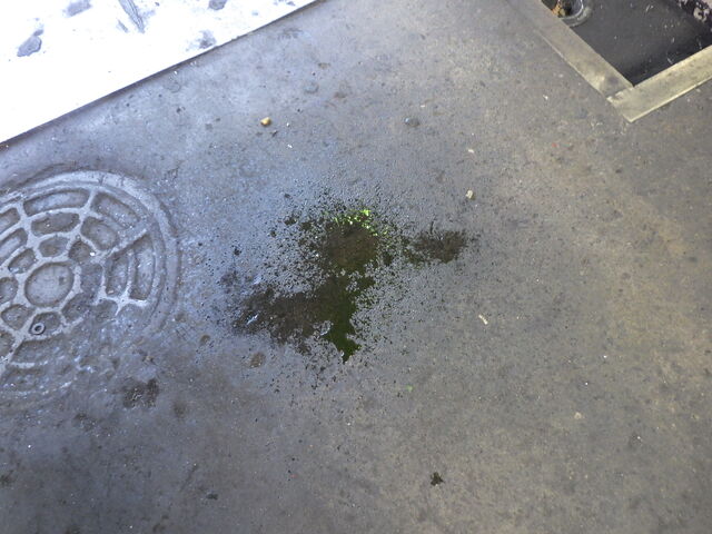 作業中にふと車両の下を確認すると緑色の液体がポタポタと、、、